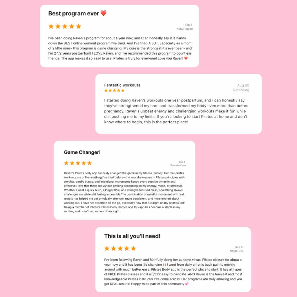 - Exclusive Community Q&As: Connect with Raven and the Pilates Body Hotties community for tips, inspiration, and personalized insights during exclusive Q&A sessions.